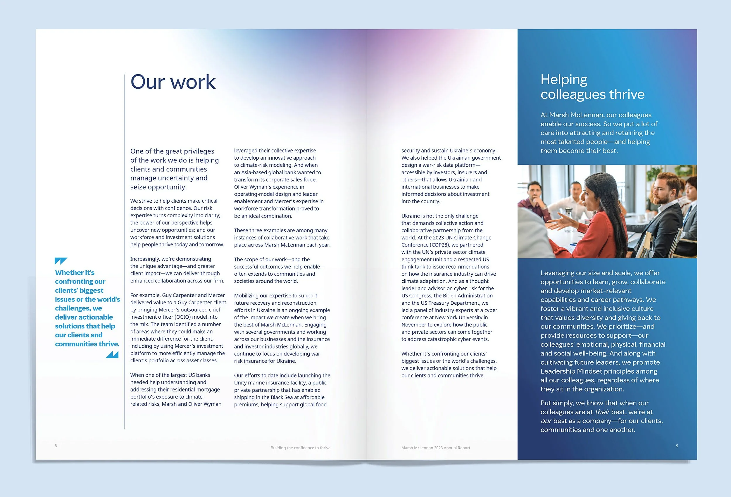 Working with the theme, “Building the Confidence to Thrive,” FGI created a report that is a powerful presentation of Marsh’s leadership and global scale and participation in virtually every industry and every market that affects their clients.