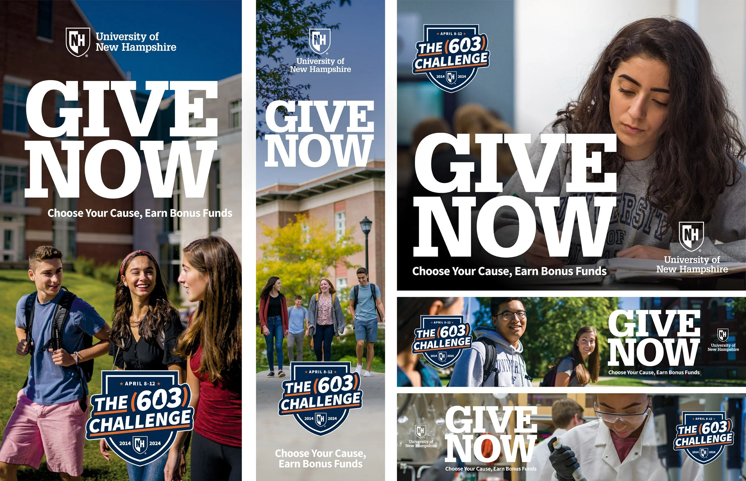 FGI collaborated with the development team to create the overall visual identity and color palette, save the date postcards, an all-inclusive website that was “live” throughout the challenge, as well as a university-wide social media campaign using the hashtag #UNH603.